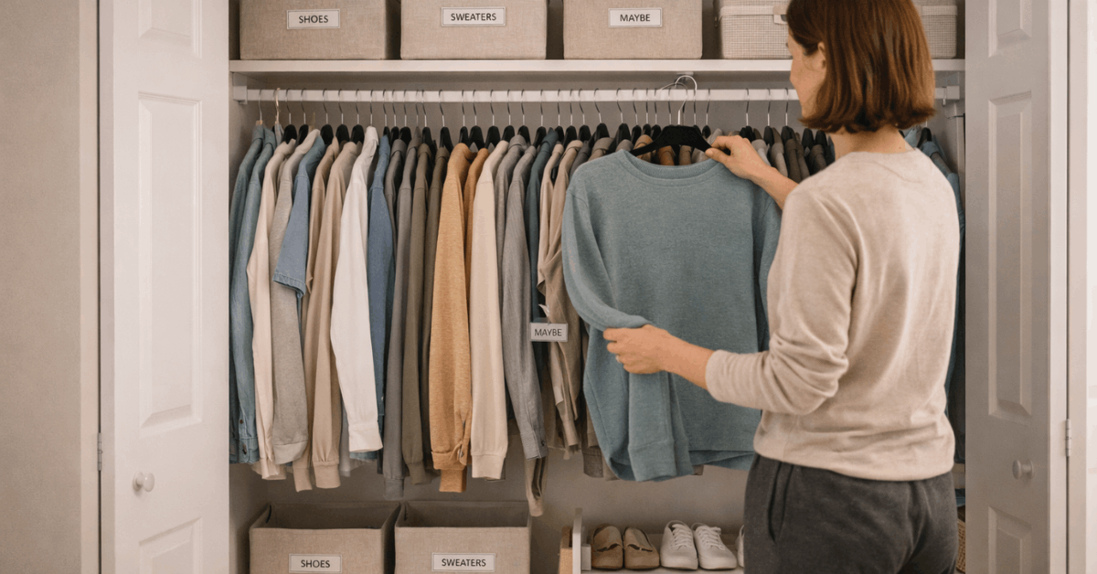 Empty the closet in sections and run a short try-on session for fit and damage checks. Separate career wear, casual wear, workout gear, and sleepwear. Use slim hangers for density and shelf dividers for sweaters that slump into piles.