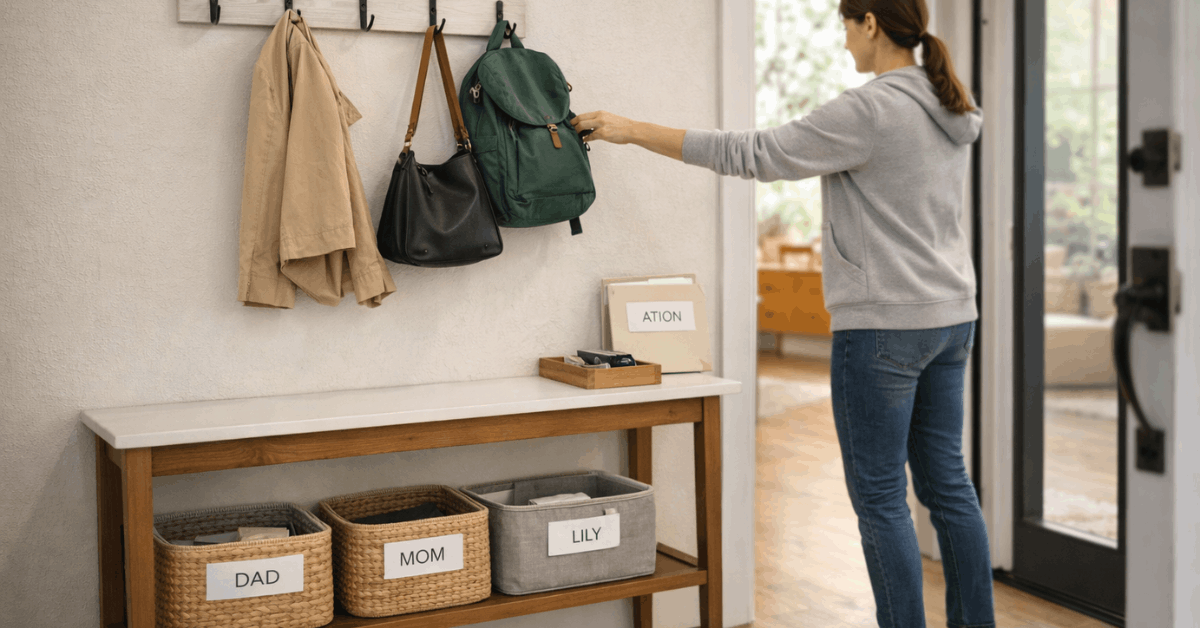 Create a landing zone that actually matches daily traffic. One tray for keys, one bin for mail, and one hook per person ends most pileups. Use closed storage for toys and remotes so surfaces reset quickly after use.