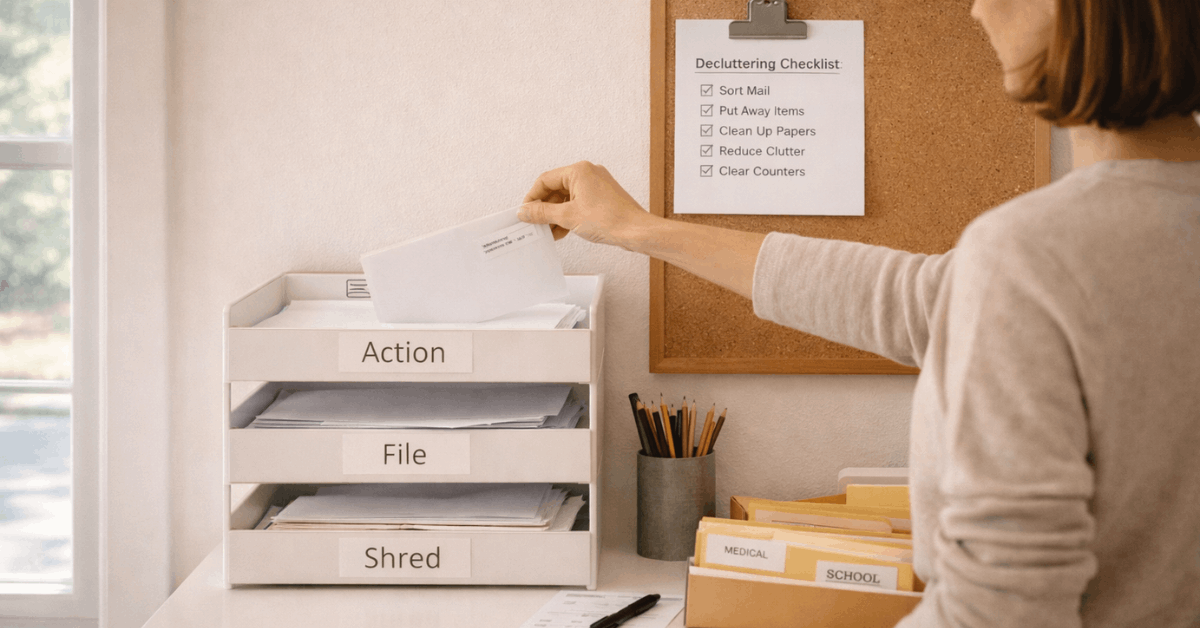- Do a quick paper triage at the mail drop: recycle, action this week, file, or shred.