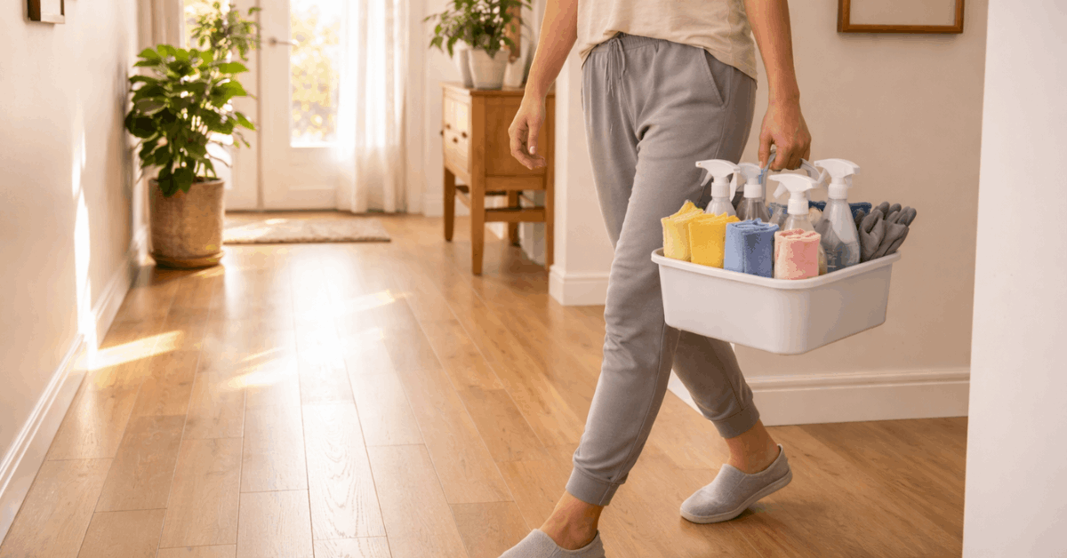 Microfiber removes fine dust and fingerprints without scratches, while scrubbing pads handle textured grout and tubs. Gloves protect skin from detergents and disinfectants, and a caddy keeps everything moving from room to room.