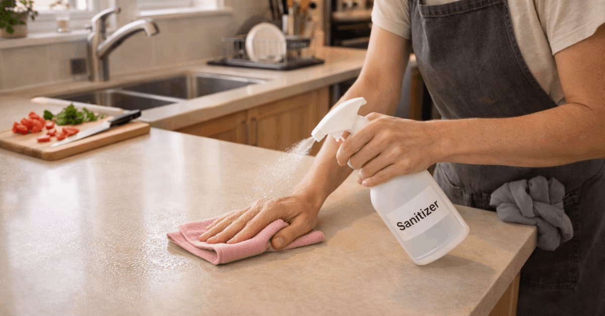 Sanitizing follows thorough cleaning and targets lower-risk reduction on food contact or child-contact items. For hard counters and prep boards, wash with hot, soapy water, then apply a weaker bleach solution or a labeled sanitizing product, allowing full contact time.